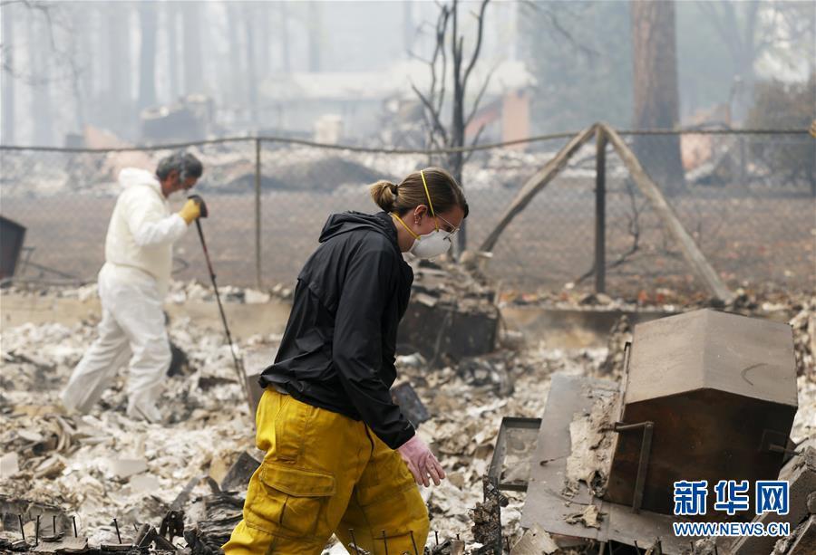 11月19日,在美國(guó)加利福尼亞州比尤特縣天堂鎮(zhèn),救援人員在山火廢墟中工作。新華社記者吳曉凌攝