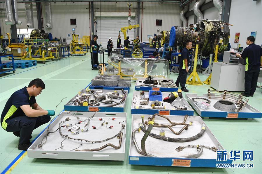 11月15日,在福建自貿(mào)區(qū)廈門片區(qū)的新科宇航科技有限公司航空維修車間內(nèi),技術(shù)人員在拆解飛機發(fā)動機。新華社記者姜克紅攝