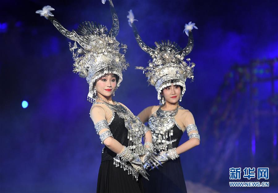 11月21日,演員表演舞蹈《苗族銀落》。 當(dāng)日,廣西柳州市第一屆旅游產(chǎn)業(yè)發(fā)展大會(huì)暨2018第十八屆中國(guó)·融水苗族蘆笙斗馬節(jié)開(kāi)幕式晚會(huì)在融水苗族自治縣舉行。 新華社記者 周華 攝