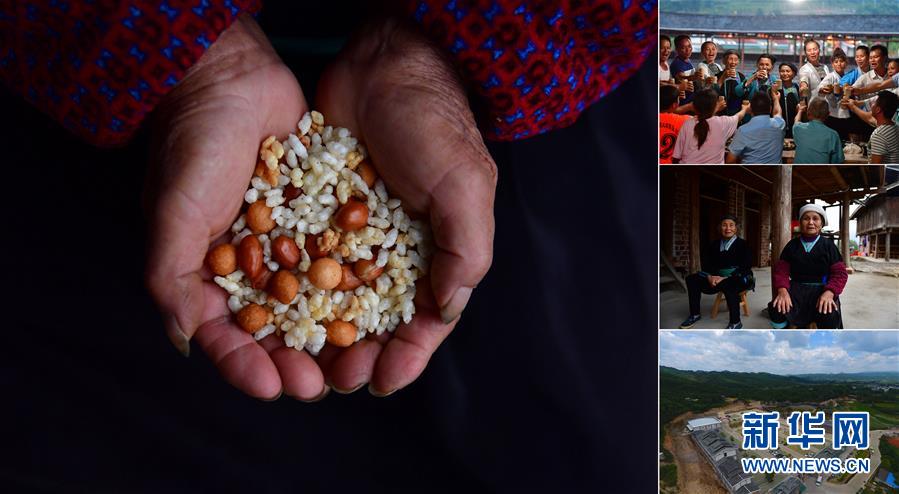 拼版照片:左圖為在廣西融水雙龍溝森林旅游度假區(qū)夢嗚苗寨,70歲的韋院媽手捧油茶原料:花生、油果、蔭米(11月20日攝);右上圖為韋院媽(左六)在景區(qū)里和游客們一起歡度苗族新禾節(jié)(7月18日攝);右中圖為韋院媽(右)在家里休息(11月20日攝);右下圖為夢嗚苗寨(7月19日無人機拍攝)。韋院媽是桿洞鄉(xiāng)錦洞村的貧困戶,今年3月,她和村里的13戶貧困戶一起舉家搬到雙龍溝森林旅游度假區(qū)打造的夢嗚苗寨,景區(qū)將貧困戶引入苗寨生活工作,保證貧困家庭有穩(wěn)定的收入。 廣西融水苗族自治縣是國家扶貧工作重點縣,全縣“九山半水半分田”,生活生產環(huán)境較為惡劣,脫貧攻堅任務艱巨,目前還有7.68萬貧困人口。面對經(jīng)濟發(fā)展落后、貧困面廣且程度深的現(xiàn)狀,當?shù)匕衙撠毠耘c創(chuàng)新產業(yè)扶持相結合,依托生態(tài)資源優(yōu)勢,實施“特色產業(yè)富民行動”,通過發(fā)展特色民族旅游、林下經(jīng)濟和特色養(yǎng)殖業(yè)等扶貧產業(yè),帶動貧困群眾依靠勤勞的雙手,拔窮根摘窮帽,實現(xiàn)脫貧致富。據(jù)了解,目前全縣貧困戶參與特色產業(yè)發(fā)展的有2.9萬戶,扶貧產業(yè)覆蓋率達95%。 新華社記者 黃孝邦 攝