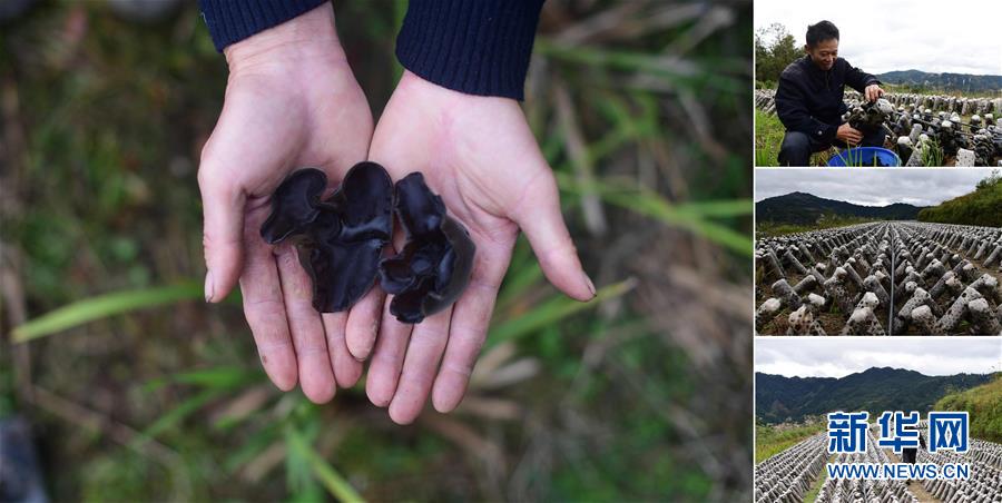拼版照片:左圖為在大浪鎮(zhèn)上里村,致富帶頭人唐志海手捧剛剛收獲的木耳;右上圖為唐志海在木耳種植基地里采摘木耳;右中圖為木耳種植基地;右下圖為唐志海在木耳種植基地里查看木耳長勢(照片均攝于11月18日)。近年來,上里村依靠發(fā)展紅薯、木耳種植,已于2016年實現(xiàn)脫貧。 廣西融水苗族自治縣是國家扶貧工作重點縣,全縣“九山半水半分田”,生活生產環(huán)境較為惡劣,脫貧攻堅任務艱巨,目前還有7.68萬貧困人口。面對經(jīng)濟發(fā)展落后、貧困面廣且程度深的現(xiàn)狀,當?shù)匕衙撠毠耘c創(chuàng)新產業(yè)扶持相結合,依托生態(tài)資源優(yōu)勢,實施“特色產業(yè)富民行動”,通過發(fā)展特色民族旅游、林下經(jīng)濟和特色養(yǎng)殖業(yè)等扶貧產業(yè),帶動貧困群眾依靠勤勞的雙手,拔窮根摘窮帽,實現(xiàn)脫貧致富。據(jù)了解,目前全縣貧困戶參與特色產業(yè)發(fā)展的有2.9萬戶,扶貧產業(yè)覆蓋率達95%。 新華社記者 黃孝邦 攝