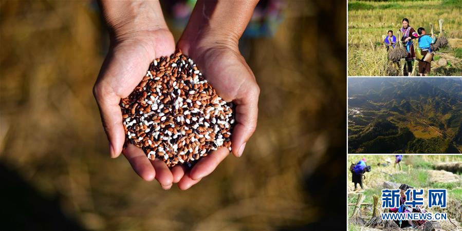 拼版照片:左圖為在安太鄉(xiāng)元寶村,合作社負責人謝秀萍手捧今年收獲的三色香糯;右上圖為合作社負責人謝秀萍(中)和社員們在收香糯;右中圖為位于苗山深處的香糯種植基地;右下圖為謝秀萍在收香糯(照片均攝于10月30日)。謝秀萍是當?shù)叵闩捶N植合作社負責人,帶動幾百戶貧困戶種植香糯。香糯是廣西融水大苗山的特產,它生長在高寒高海拔的特殊自然環(huán)境中,產量少,營養(yǎng)價值高。 廣西融水苗族自治縣是國家扶貧工作重點縣,全縣“九山半水半分田”,生活生產環(huán)境較為惡劣,脫貧攻堅任務艱巨,目前還有7.68萬貧困人口。面對經(jīng)濟發(fā)展落后、貧困面廣且程度深的現(xiàn)狀,當?shù)匕衙撠毠耘c創(chuàng)新產業(yè)扶持相結合,依托生態(tài)資源優(yōu)勢,實施“特色產業(yè)富民行動”,通過發(fā)展特色民族旅游、林下經(jīng)濟和特色養(yǎng)殖業(yè)等扶貧產業(yè),帶動貧困群眾依靠勤勞的雙手,拔窮根摘窮帽,實現(xiàn)脫貧致富。據(jù)了解,目前全縣貧困戶參與特色產業(yè)發(fā)展的有2.9萬戶,扶貧產業(yè)覆蓋率達95%。 新華社記者 黃孝邦 攝