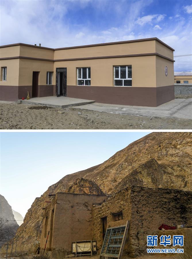 拼版照片:上圖為都熱·加爾曼在塔提庫力易地扶貧搬遷安置點的80平方米的新房(11月18日攝);下圖為都熱·加爾曼在阿克托尕欄桿村一組的老房子外景(11月17日攝)。新華社記者胡虎虎攝