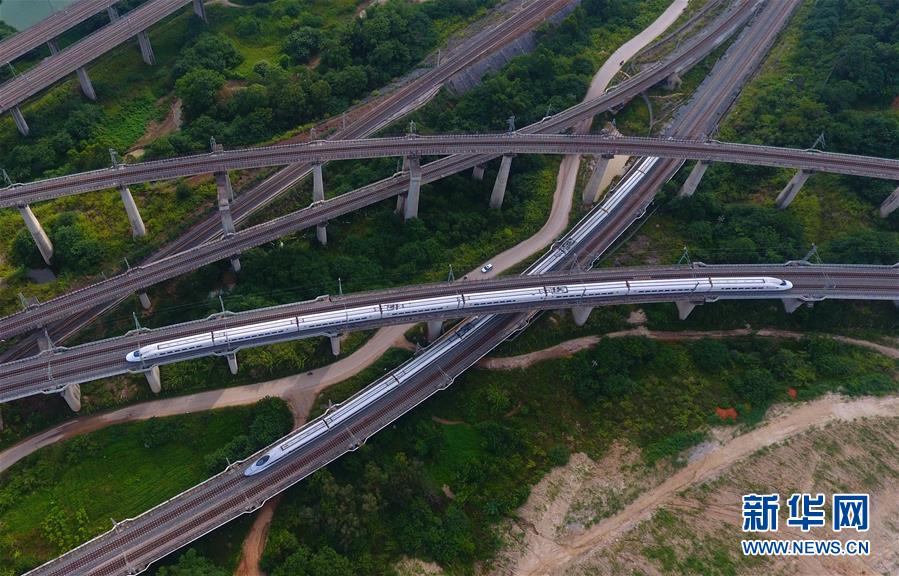 一列動車在南寧市區(qū)行駛(9月4日無人機拍攝)。 廣西壯族自治區(qū)成立60年來,鐵路建設(shè)發(fā)生翻天覆地的變化。來自中國鐵路南寧局集團有限公司的數(shù)據(jù)顯示,1958年廣西鐵路總里程為1346.3公里,如今廣西鐵路總里程達5191公里。廣西與周邊相鄰省份間實現(xiàn)動車“公交化”開行。此外,北部灣港—重慶班列、東盟海產(chǎn)品冷鏈班列、“百色一號”果蔬專列等的開通和運營,強化了鐵路供給的針對性和有效性。鐵路成為助推廣西經(jīng)濟社會快速發(fā)展的“大動脈”。 新華社記者陸波岸攝