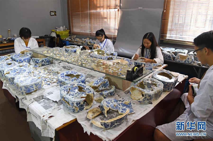 在江西景德鎮(zhèn)御窯廠遺址,工作人員正在修復明代瓷枕(9月20日攝)。 新華社記者 萬象 攝