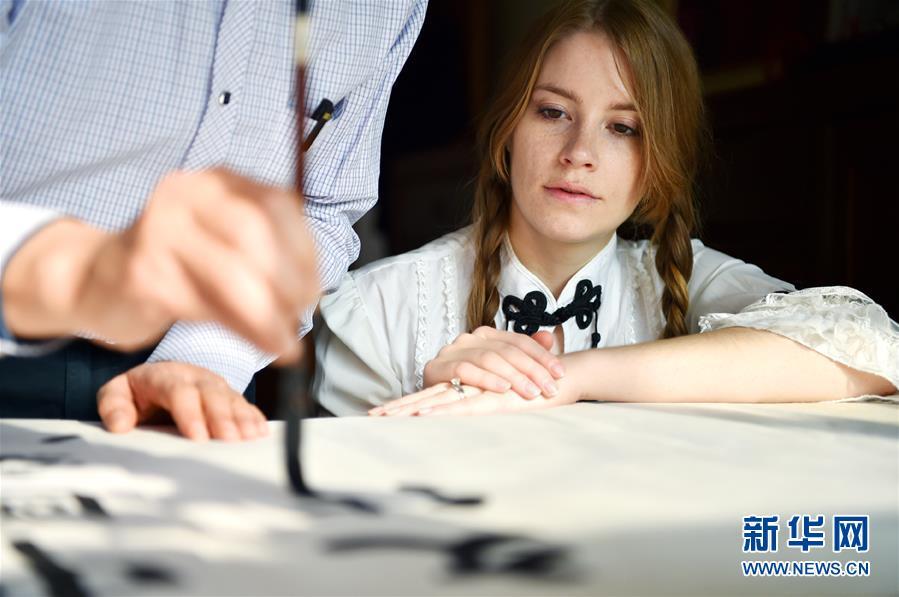 11月24日,在石家莊橋西區(qū)家中,艾米莉跟公公學(xué)習(xí)中國書法。 新華社發(fā)(張曉峰 攝)