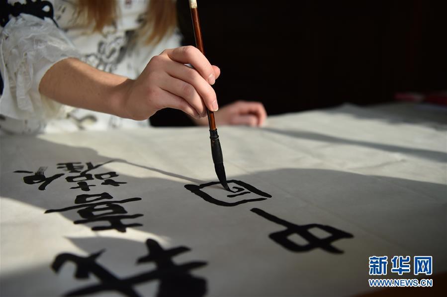 11月24日,在石家莊橋西區(qū)家中,艾米莉在練習(xí)書(shū)法。 新華社發(fā)(張曉峰 攝)