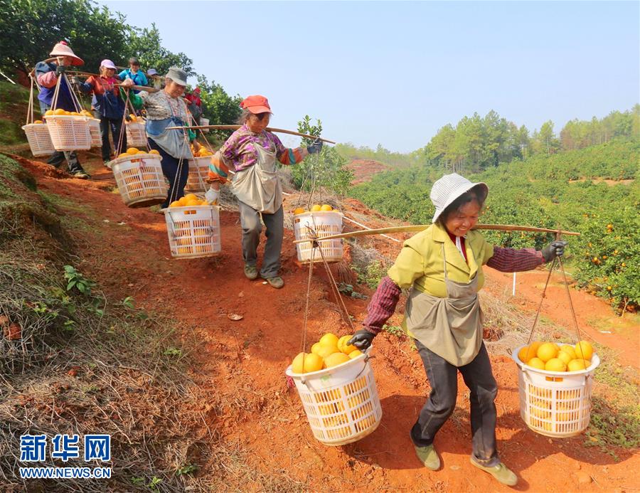 11月23日,于都縣新陂鄉(xiāng)的果農在挑運臍橙。