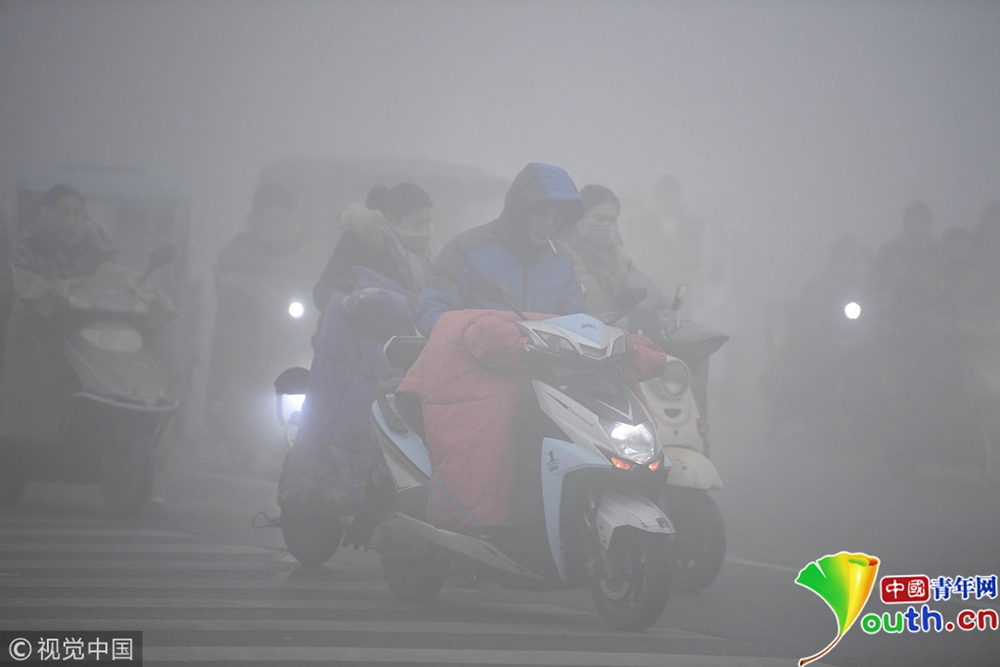 2018年11月26日,全國多地出現大霧天氣。安徽亳州,市民在大霧彌漫的街頭出行。