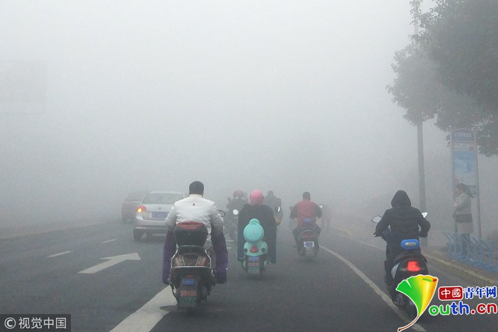 2018年11月26日,全國多地出現(xiàn)大霧天氣。安徽亳州,市民在大霧彌漫的街頭出行。