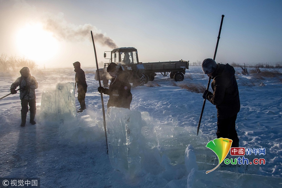 當(dāng)?shù)貢r(shí)間2018年11月27日,雅庫(kù)茨克,零下41攝氏度左右的氣溫下,村民在當(dāng)?shù)氐囊粋€(gè)湖中采集冰塊。當(dāng)?shù)睾芏嗳艘蕾囉谌诨鶋K解決供水,因?yàn)槎嗄陜鐾粮采w地區(qū)冬季氣溫極低,沒(méi)有其他的方式供應(yīng)水。