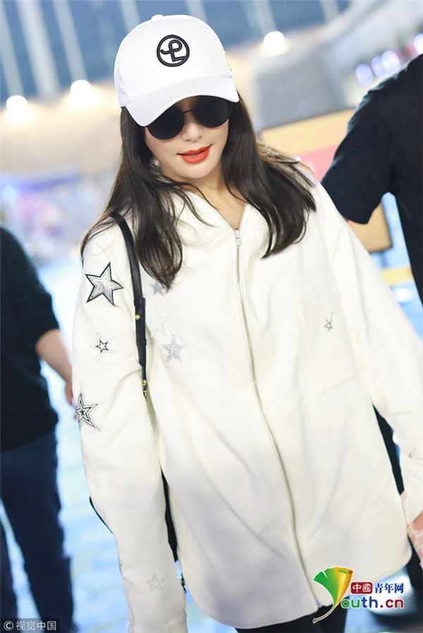 秦嵐穿星星外套活力四射 架黑超涂紅唇笑靨如花