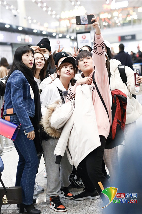 2018年12月3日,北京,“火箭少女101”全體成員現(xiàn)身機場前往國外錄制團總綜。其中孟美岐戴著墨鏡,一身全黑運動裝扮,大步流星氣場超強,楊蕓晴、yamy、楊超越等成員緊隨其后,大家還一起在機場玩起自拍,好不歡樂。