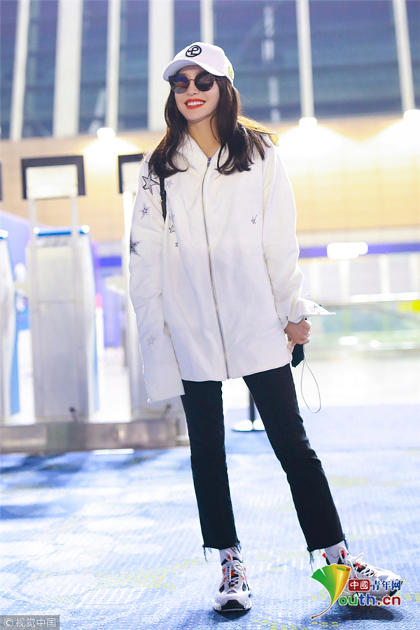 11月29日,上海,秦嵐現(xiàn)身機(jī)場(chǎng)。她戴白色鴨舌帽,穿白色星星圖案外套配微喇牛仔褲,架黑超涂紅唇笑靨如花。