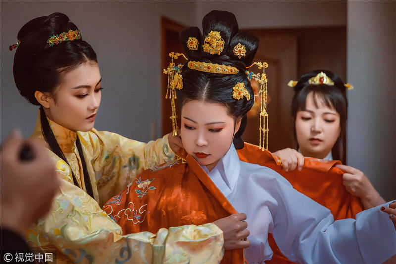 2018年11月18日,浙江嘉興。女孩黃聰今年30歲,是浙江省海寧市硤石人,是一位對漢文化情有獨(dú)鐘的個(gè)性女孩。對于這一次的漢婚大禮的每一個(gè)細(xì)節(jié),都非常仔細(xì)。小到發(fā)簪首飾,大到日常禮儀。說起為什么會舉辦這樣一場古風(fēng)婚禮,她說自己從2013年戀上漢服,就下了這個(gè)決定。