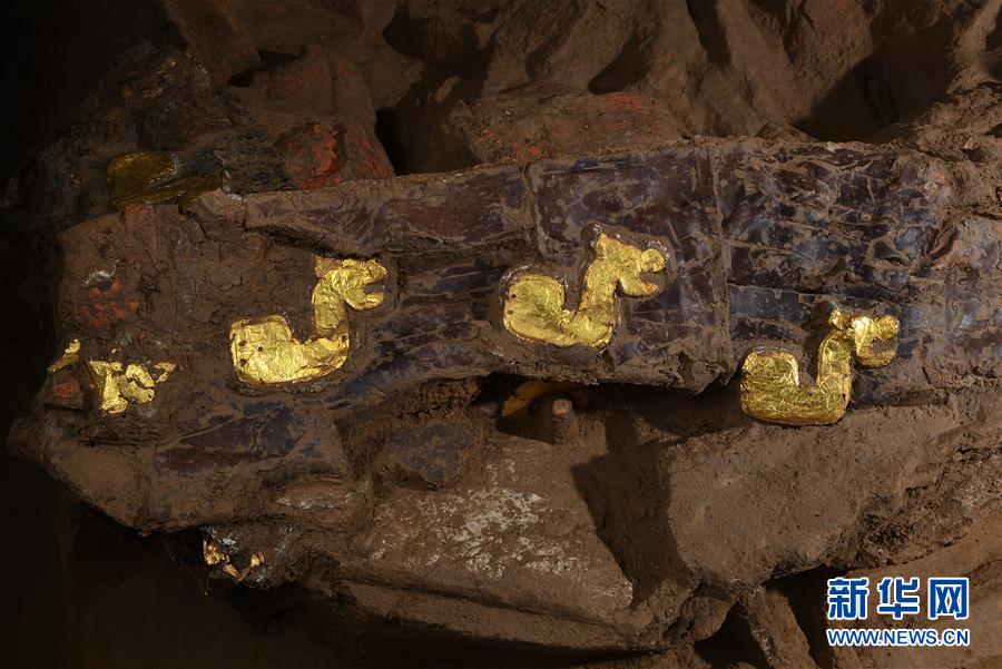 這是在位于河北行唐的考古實驗室內(nèi)拍攝的局部車廂上鑲嵌有成組對稱的貼有金箔飾片的金屬質(zhì)獸型牌飾(12月4日攝)。新華社記者 李賀 攝
