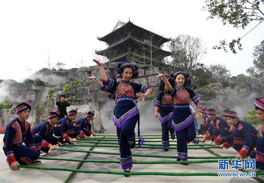 12月6日,演員在第十二屆中國(南寧)國際園林博覽會八桂天境園(廣西園)前跳竹杠舞。 新華社記者 周華 攝
