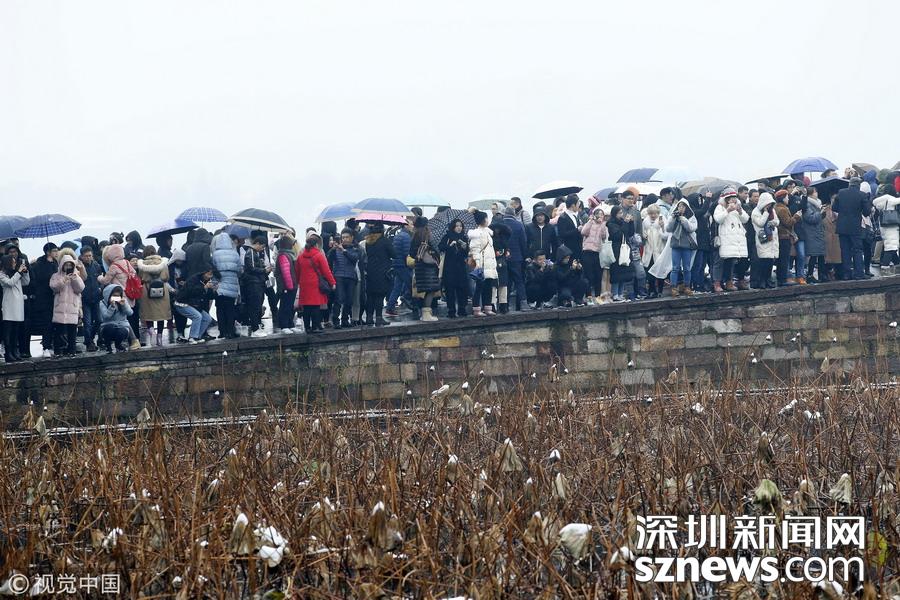 深圳新聞網(wǎng)訊 2018年12月8日,杭州,當日市區(qū)普降大雪,市民和游客扎堆涌入西湖景區(qū),拍攝最美雪景照片以及為自己留影。每次杭州一下雪,斷橋便成為眾多游客欣賞雪景、拍攝雪景的地方,大家都想看看“斷橋殘雪”。游客們扎堆涌入斷橋后,人山人海,讓現(xiàn)場堪比春運場景。因為人太多,雪積不起來,斷橋看不到殘雪。