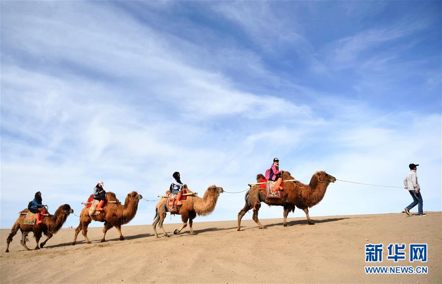 游客在敦煌鳴沙山騎駱駝(2017年5月3日攝)。 敦煌記錄歷史。開放的胸襟,曾讓這里成為古代絲綢之路上“華戎所交一都會(huì)”。 時(shí)隔千年,改革開放的春風(fēng)吹入西北內(nèi)陸小城,敦煌再度成為中國對外開放的文化前沿。 新華社記者 陳斌 攝