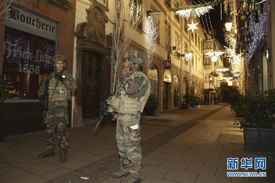 12月11日,士兵在法國(guó)斯特拉斯堡市中心的槍擊事件現(xiàn)場(chǎng)附近警戒。 新華社記者葉平凡攝