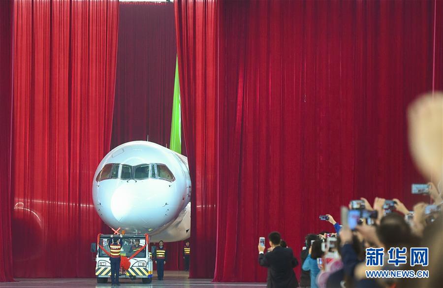 我國自主研制的C919大型客機首架機,在中國商飛公司總裝制造中心浦東基地廠房內(nèi)正式下線(2015年11月2日攝)。新華社發(fā)(裴鑫攝)