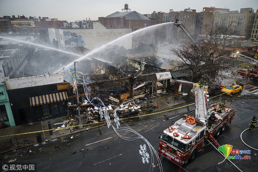 當地時間2018年12月13日,美國紐約,在紐約皇后區(qū)皇后大道,一場大火吞噬了六家商鋪。圖片作者:Drew Angerer