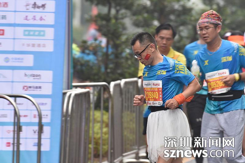 2018年12月16日,深圳國際馬拉松位于后海的折返點(diǎn),一名著女式短裙的選手正在向終點(diǎn)沖刺。