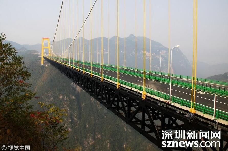 【世界第一高懸索橋——四渡河大橋】四渡河特大橋位于巴東縣野三關(guān)鎮(zhèn)四渡河,大橋主跨900米,橋面與峽谷谷底高差達560米,相當于200層樓高,是目前國內(nèi)在深山峽谷里修建的最大跨度懸索橋,比目前世界最高橋法國米約大橋還要高290米,被譽為世界第一高懸索橋。