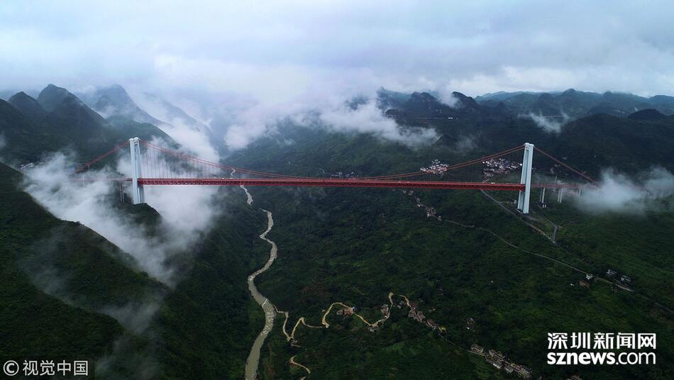 當日,杭瑞高速貴州省畢節(jié)至都格(黔滇界)公路北盤江大橋上云霧繚繞,美景如畫。北盤江大橋主橋跨徑720米,橋面到谷底垂直高度565米。