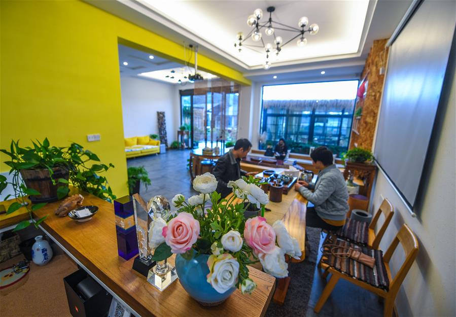 12月15日,客人在朱家尖烏石塘“漁夫客棧”民宿大廳喝茶。該民宿有海景房7間,餐飲包廂8個。 新華社記者 徐昱 攝