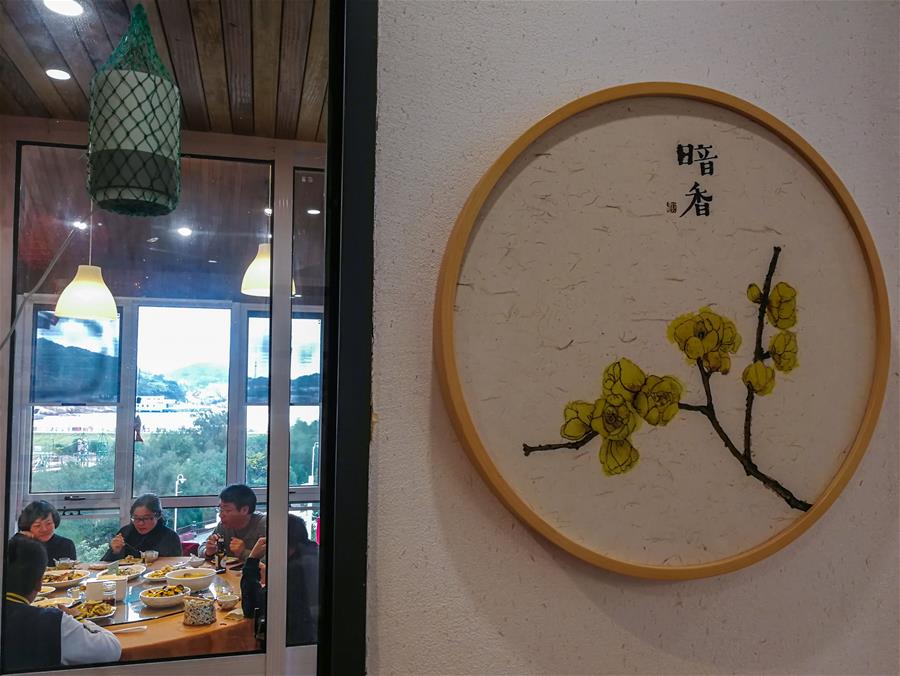 12月15日,客人在朱家尖烏石塘“漁夫客?!泵袼薨鼛麅?nèi)用餐,該民宿有海景房7間,餐飲包廂8個。 新華社記者 徐昱 攝