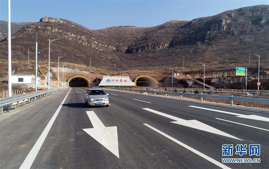 12月16日,一輛汽車行駛在京秦高速公路二期工程河北玉田境內(nèi)的鳳凰頂隧道路段(無(wú)人機(jī)拍攝)。 新華社記者楊世堯攝