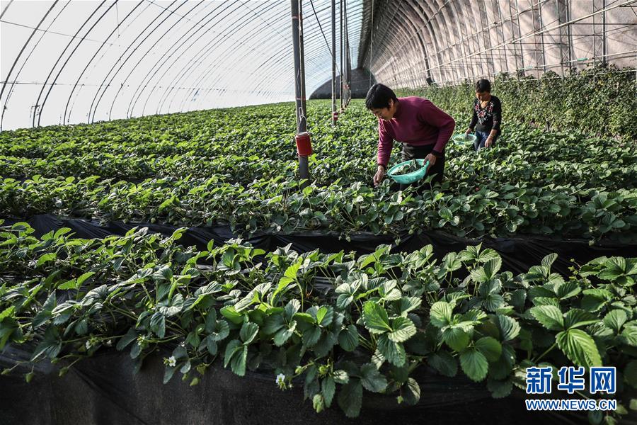 12月19日,農(nóng)戶(hù)在大棚里管理草莓。 2017年5月,遼寧省鐵嶺市昌圖縣大四家子鎮(zhèn)方家船口村利用土地確權(quán)成果,由村兩委班子成員領(lǐng)辦創(chuàng)辦了昌圖久晟果木蔬菜種植專(zhuān)業(yè)合作社。到2018年9月,合作社利用產(chǎn)業(yè)扶貧資金、壯大村集體經(jīng)濟(jì)扶持資金、村集體用地和村民入股資金建成了11個(gè)“股份制大棚”,主要種植草莓等作物,產(chǎn)品通過(guò)電商銷(xiāo)往云南、四川、北京、上海等地,預(yù)計(jì)第一期可為265名貧困戶(hù)每人分紅860元。 新華社記者潘昱龍攝