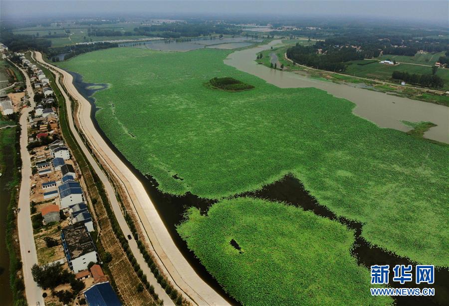 這是河南省民權(quán)縣任莊村內(nèi)的荷花生態(tài)園(7月7日無(wú)人機(jī)拍攝)。 新華社記者 李安 攝