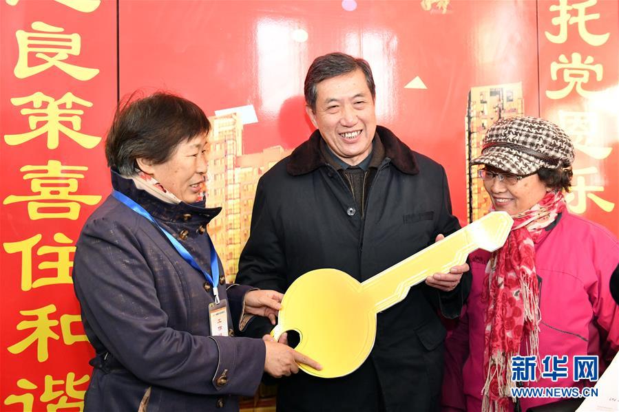 12月20日,回遷居民遲明德(中)成為和諧佳苑小區(qū)第一位辦理回遷入住的居民。 當(dāng)日,濟(jì)南市槐蔭區(qū)經(jīng)十一路棚戶區(qū)改造項(xiàng)目——和諧佳苑小區(qū)正式交付居民回遷安居。作為濟(jì)南市槐蔭區(qū)頭號(hào)民生工程,本項(xiàng)目共17棟安置樓,實(shí)現(xiàn)棚戶區(qū)居民“出棚進(jìn)樓”,改善安居環(huán)境。 新華社記者 郭緒雷 攝