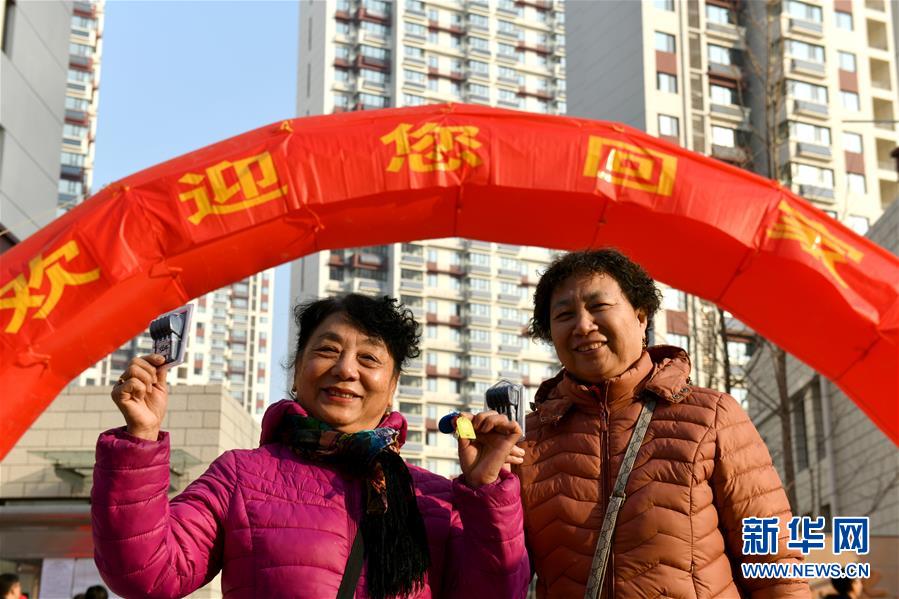 12月20日,在濟(jì)南市槐蔭區(qū)和諧佳苑小區(qū),回遷居民邵虹(左)和賈桂芝展示領(lǐng)到的回遷房鑰匙。 當(dāng)日,濟(jì)南市槐蔭區(qū)經(jīng)十一路棚戶區(qū)改造項(xiàng)目——和諧佳苑小區(qū)正式交付居民回遷安居。作為濟(jì)南市槐蔭區(qū)頭號(hào)民生工程,本項(xiàng)目共17棟安置樓,實(shí)現(xiàn)棚戶區(qū)居民“出棚進(jìn)樓”,改善安居環(huán)境。 新華社記者 郭緒雷 攝