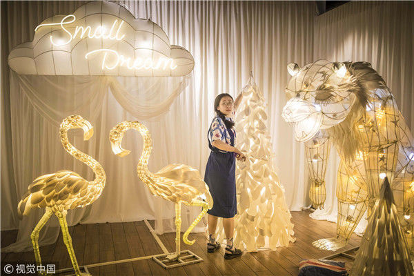 2018年5月6日,廣州,在天河區(qū)一家大商場辦個展時,用紙片做成的北極熊、大松樹、火烈鳥、紙房子在光線的配合下美輪美奐,吸引了很多顧客駐足?!皫缀趺總€人一看到,都會走進那個夢幻的場景里,和這些紙雕一起合影。”圖片攝于2018年5月6日。南塘/視覺中國