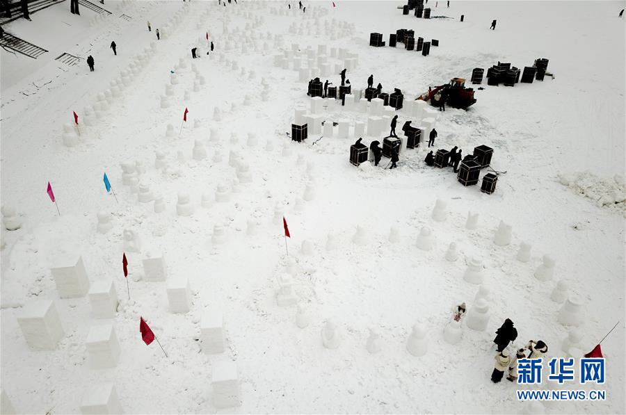 在松花江哈爾濱段江面上,制作中的部分雪人(12月21日無人機(jī)拍攝)。