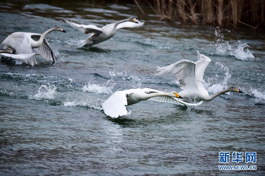 12月21日,幾只天鵝在黃河岸邊嬉戲。新華社記者吳剛攝
