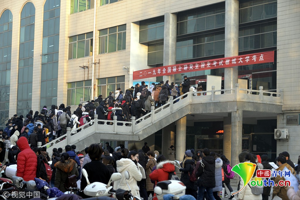 2018年12月22日,山東聊城,2019全國碩士研究生招生考試聊城大學(xué)考點(diǎn),考生們?cè)陉懤m(xù)進(jìn)入考點(diǎn)。