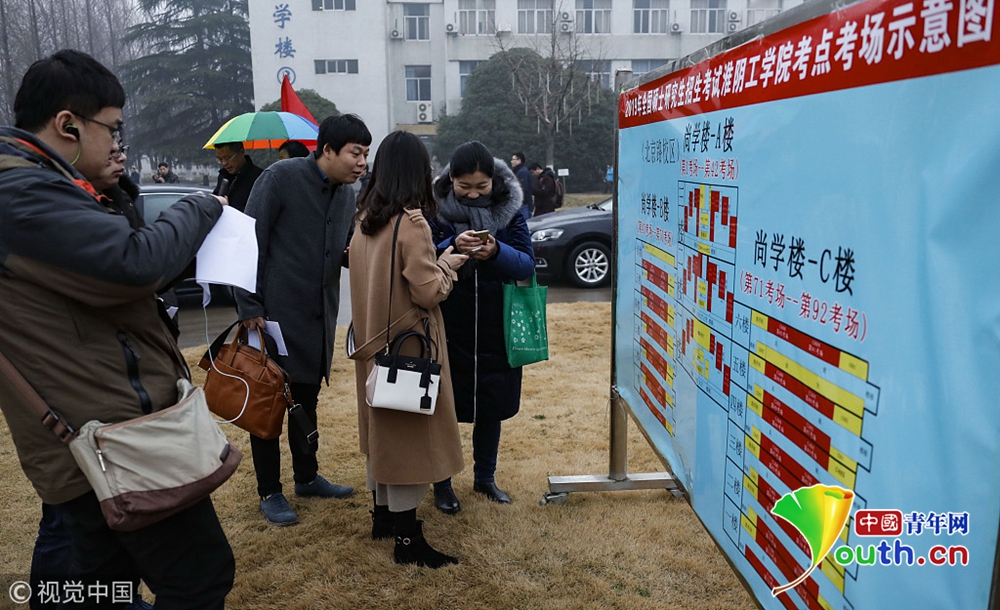 2018年12月22日,南京,在南京林業(yè)大學(xué)考點(diǎn),考生在雨中復(fù)習(xí),看考場(chǎng)分布圖,候考和進(jìn)場(chǎng)。