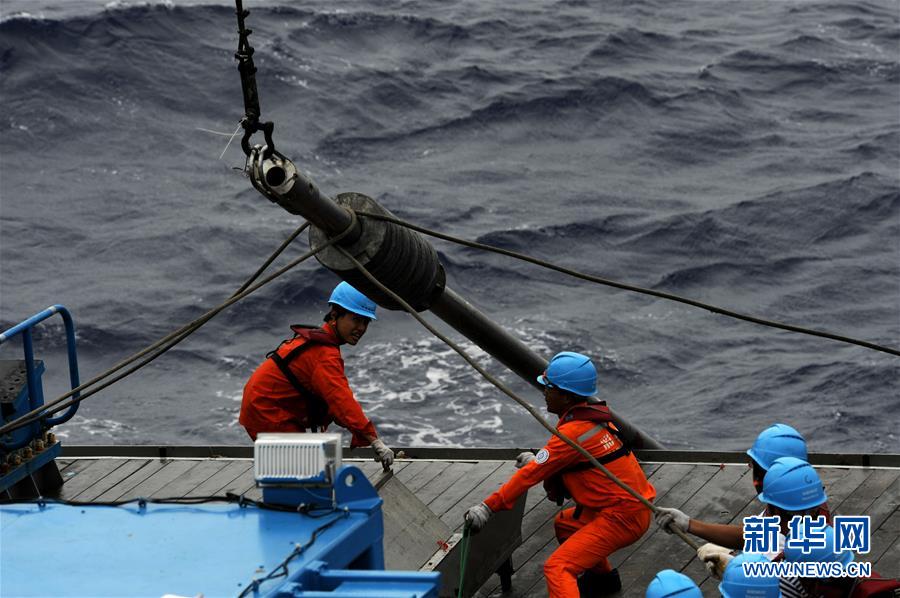 科考團隊成員在船上回收箱式采樣器(12月20日攝)。