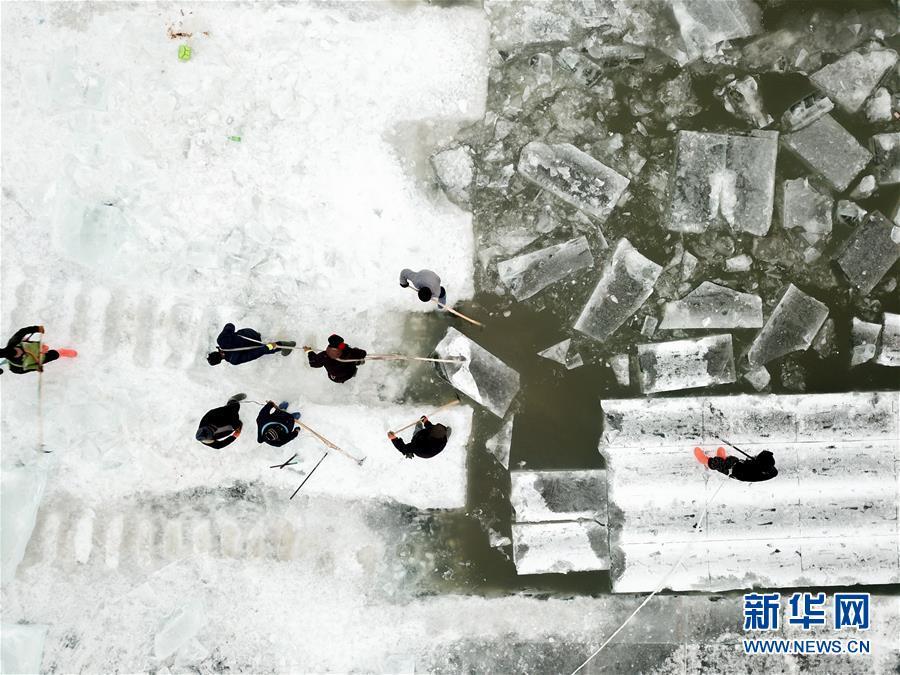 在松花江哈爾濱段江面,工人們在進行切割和采冰工作(12月12日無人機拍攝)。 黑龍江哈爾濱市的冰雪主題樂園哈爾濱冰雪大世界的采冰和建設(shè)工作近日拉開帷幕。為保證足夠的優(yōu)質(zhì)冰供給,每天有近千名采冰人和700多輛運冰車參與到采冰工作。 新華社記者 王松 攝