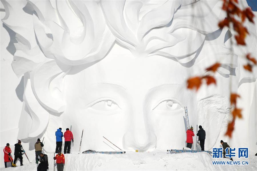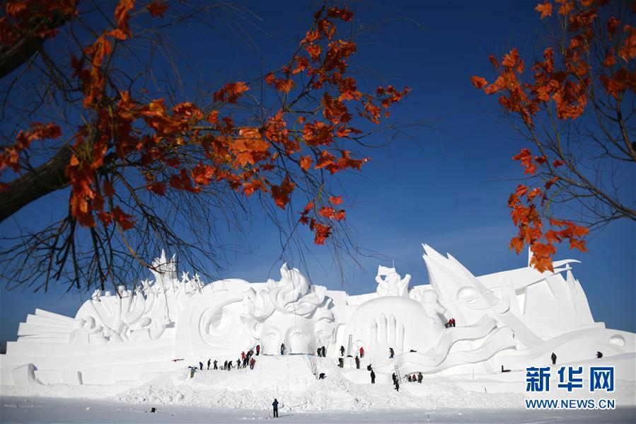 12月24日,雪雕師在制作太陽島雪博會主塑“星河之旅”。 當(dāng)日,哈爾濱太陽島雪博會主塑露出“芳容”。本屆雪博會主塑“星河之旅”長106米,高32米,寬20米,用雪量達4萬立方米。 新華社記者 王建威 攝