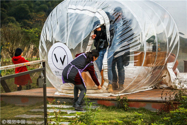 2018年12月17日,廣西桂林,陽朔縣遇龍河畔。主人引領(lǐng)游客走進(jìn)泡泡屋。