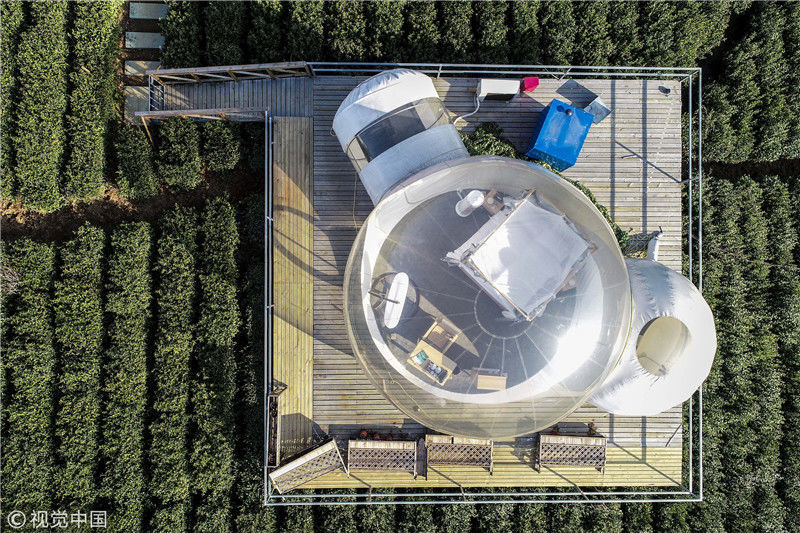 2018年12月18日,江蘇常州金壇茅山百畝茶田中的帳篷酒店和泡泡屋美不勝收。這里打造的帳篷,泡泡屋極具特色,可以讓游客與大自然零距離接觸,這種形式的“酒店”十分撩人,深受歡迎。韓加君/視覺中國