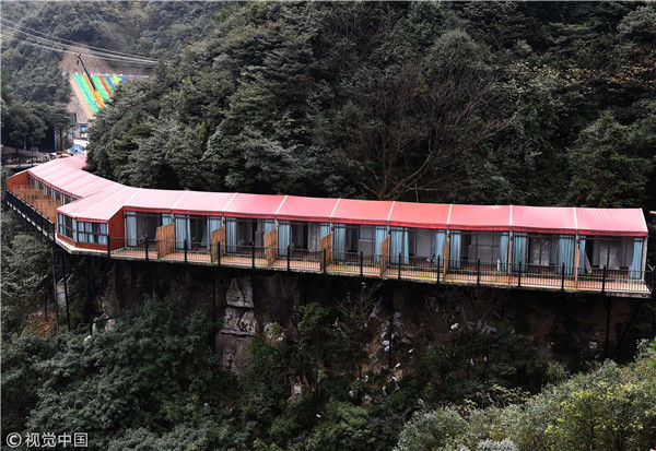 2017年11月16日,重慶萬盛一景區(qū)內(nèi)的臨崖酒店依山而建,色彩絢麗如山間彩虹。據(jù)介紹,該酒店位于當(dāng)?shù)貖W陶紀(jì)景區(qū)內(nèi),酒店順著山形而建盤旋在山間,特別顯眼。 周毅(重慶分社)/中新社/視覺中國
