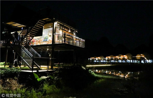 2018年12月17日,廣西桂林,陽朔縣遇龍河畔。夜色中的泡泡屋觀景臺。