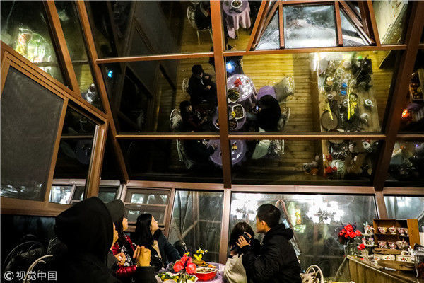 2018年12月17日,廣西桂林,陽朔縣遇龍河畔。黃昏時分,游客站在觀景臺觀賞泡泡屋及周邊景觀。