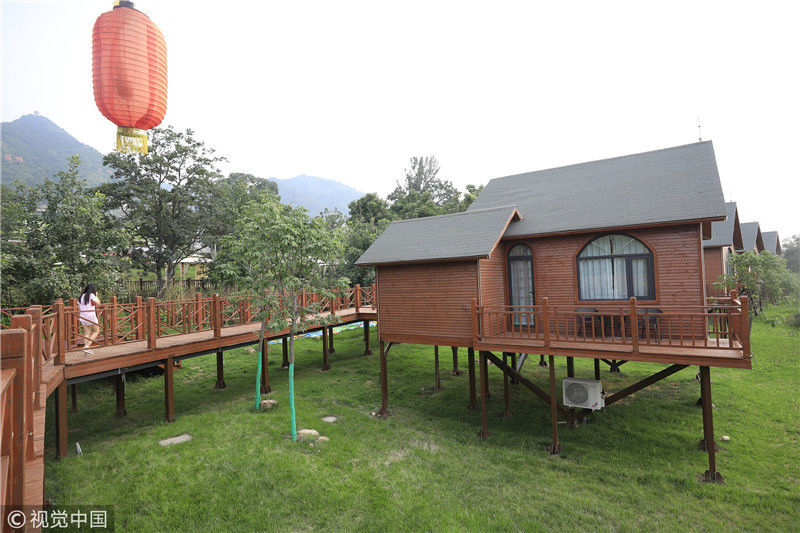 2018年7月6日,航拍陜西渭南臨渭區(qū)天留山下的小木屋民俗酒店。王警/視覺中國(guó)